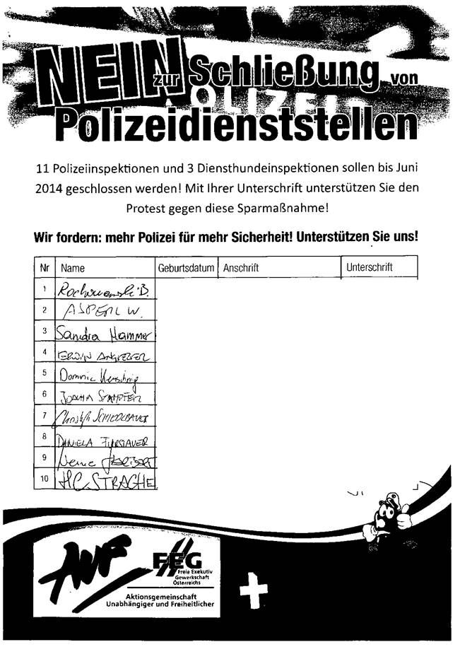 In der Anlage überreiche ich Ihnen gemäß § 100 Abs. 1 GOG-NR die Petition betreffend „Nein zur Schließung von Polizeidienststellen" in Österreich.