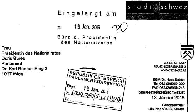 der Gemeinderat der Stadtgemeinde Schwaz hat in seiner Sitzung vom 16.12.2015 nachstehende Entschließung einstimmig gefasst: