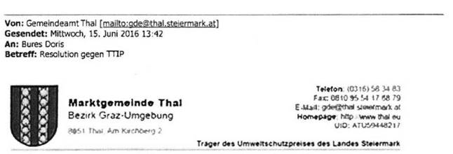 Betreff: Petition bezüglich der Resolution der Marktgemeinde Thal „TTIP & TiSA"