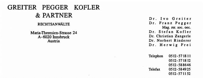 Im Herbst 1897 hat Dr. Josef Greiter seine Rechtsanwaltskanzlei eröffnet. 1926 trat sein Sohn Dr. Franz Greiter in die Kanzlei ein. 1971 trat sein Enkel Dr. Ivo Greiter in die Kanzlei ein, in der nunmehr die Rechtsanwälte Dr. Ivo Greiter, Dr. Franz Pegger, Dr. Stefan Kofler, Dr. Christian Zangerle, Dr. Norbert Rinderer und Dr. Herwig Frei gemeinsam den Anwaltsberuf ausüben.
