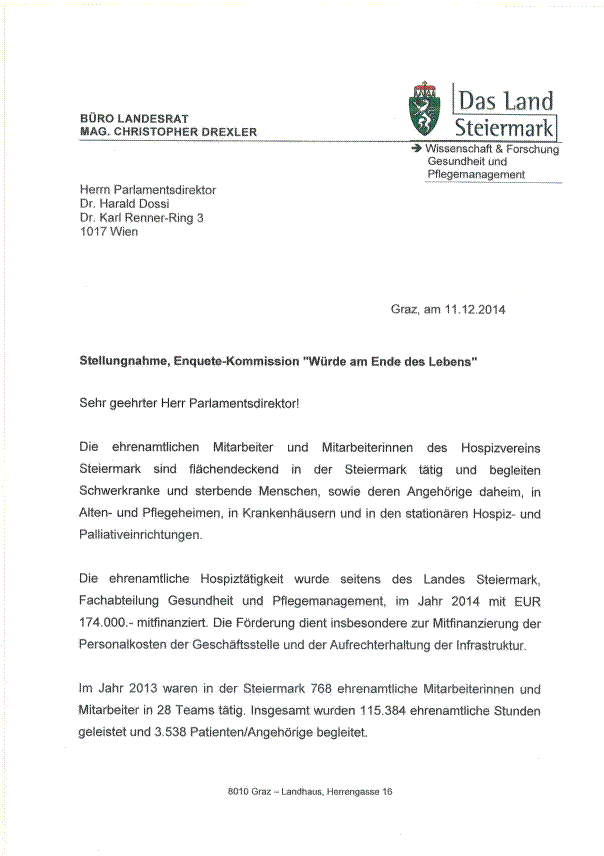 Laut Vertrag über die Finanzierung der Hospiz- und Palliativeinrichtungen - in der Steiermark - wurde für das Jahr 2014 ein max. Gesamtbetrag von Euro 6.135.566,-- festgelegt. Für 2015 wurde ein Betrag von Euro 6.288.955,-- beschlossen: