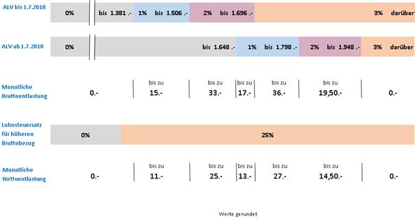 Die Bundesregierung hat den Beitrag zur Arbeitslosenversicherung weiter abgesenkt. Dieser wurde für Beträge bis 1 648 Euro (bisher 1.381 Euro) auf 0% gesenkt. Für Beträge darüber bis 1 798 Euro auf 1% (bisher 1 506 Euro) und für Beträge darüber bis 1 948 Euro (bisher 1 696 Euro) auf 1% gesenkt. Auf der Homepage des Bundeskanzleramtes wird die Maßnahme folgend beworben: