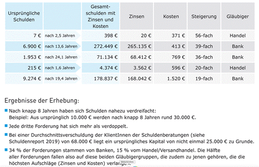 „Nach nicht einmal acht Jahren haben sich Schulden in einem zügellosen System der Schuldeneintreibung durchschnittlich nahezu verdreifacht. Es ist weder für Außenstehende noch für die Betroffenen selbst nachvollziehbar, wie – in einem realen Beispiel aus Kärnten – aus 6.900 Euro Schulden nach dreizehn Jahren 272.000 Euro werden können, das 39fache des ursprünglichen Kapitals. 90 % dieses Schuldenberges sind Zinsen.“