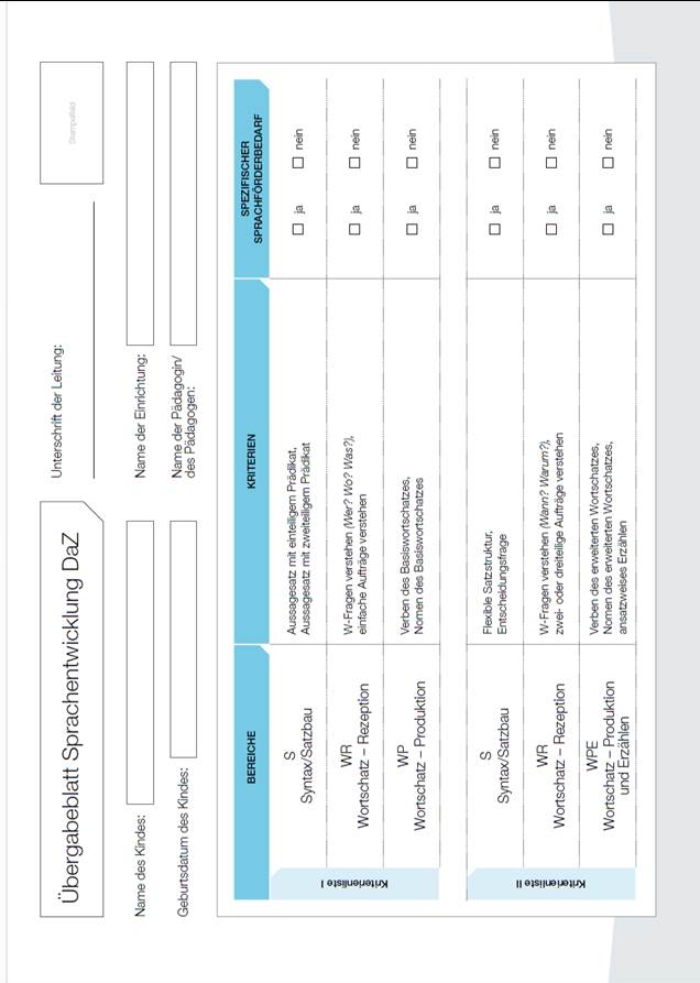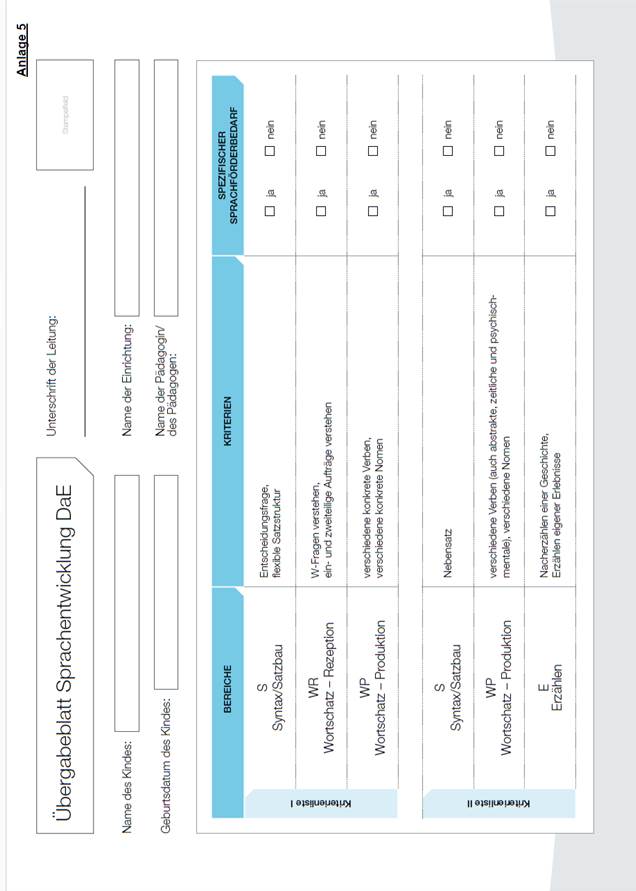 „1a. die Dokumentation des erfassten Sprachstandes vor Beginn der allgemeinen Schulpflicht durch die Beobachtungsbögen gemäß Anlage 5 sowie die Maßnahmen und Förderergebnisse der (Sprach-)Förderung ab der Schülerinnen- und Schülereinschreibung für das Schuljahr 2020/21;“