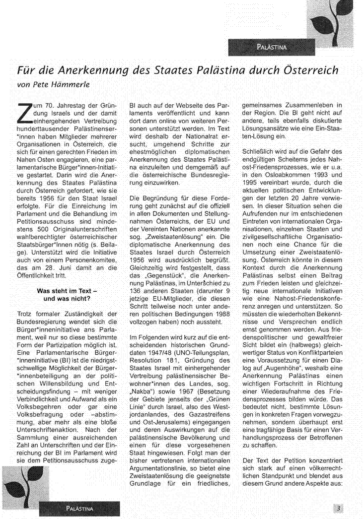 Parlamentarische Bürgerinitiative betreffend Anerkennung des Staates Palästina durch Österreich