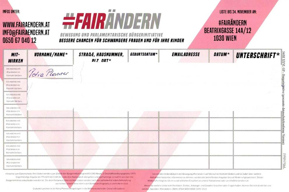 Dieses Anliegen wurde bis zur Einbringung im Nationalrat von 55.309 BürgerInnen mit ihrer Unterschrift unterstützt (Anm.: zumindest 500 rechtsgültige Unterschriften müssen für die Einbringung im Nationalrat vorliegen).