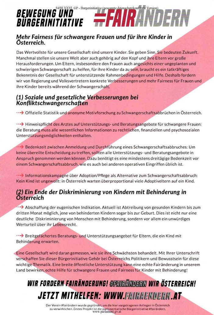 Abschaffung der eugenischen Indikation. Aktuell ist Abtreibung von gesunden Kindern bis zum dritten Monat möglich, jene von behinderten Kindern sogar bis zur Geburt. Dies ist nicht nur eine deutliche Diskriminierung von Menschen mit Behinderung, sondern vor allem ein unwürdiges Werturteil über ihr Lebensrecht.