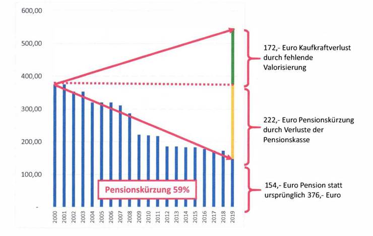 • Die Erstpension von 376,- Euro wurde nie erhöht, sondern insgesamt zwölfmal gekürzt und beträgt jetzt 154,- Euro, ist also nominell um 222,- geringer.