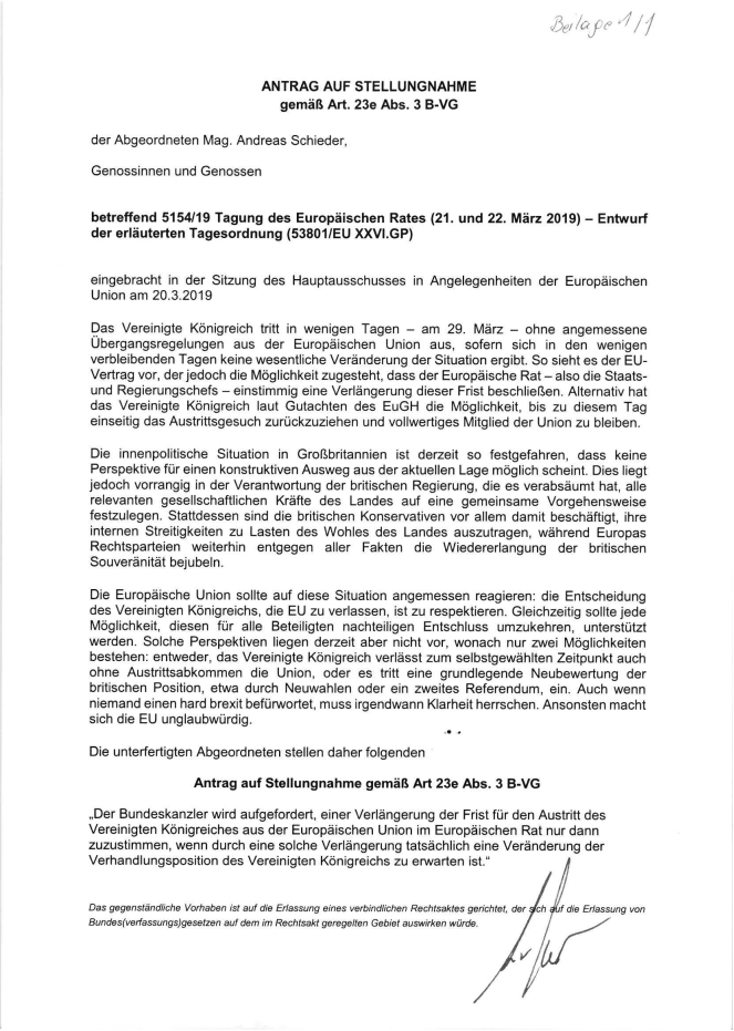 Geht es nach der SPÖ, sollte die EU eine Brexit-Verschiebung nicht unkritisch befürworten. "Nur zu sagen, nicht gegen die Wand fahren zu wollen, ist zu wenig", sagte Andreas Schieder (SPÖ). Die Oppositionspartei vermisst in der britischen Verhandlungsposition eine Perspektive für einen konstruktiven Ausweg. Theresa May sei nicht mehr der politische Garant dafür, so Schieder, die Entscheidung falle schlussendlich im britischen Unterhaus. Die Frage sei, was eine Verschiebung bringen soll, ergänzte der Abgeordnete, die Aufgabe der britischen KollegInnen sei es nun, eine Alternative zu formulieren. Ein entsprechender Antrag auf Stellungnahme, in dem die SPÖ den Bundeskanzler auffordert, einer Verlängerung der Frist für den Brexit im Europäischen Rat nur dann zuzustimmen, wenn diese eine tatsächliche Veränderung der Verhandlungsposition erwarten lässt, wurde nur von den NEOS sowie der Liste JETZT unterstützt und fand damit keine Mehrheit im Ausschuss.