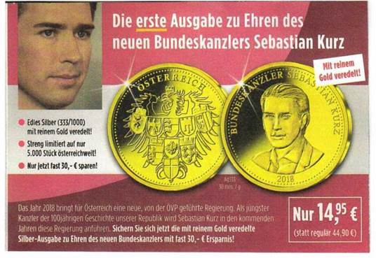 Ein Hinweis auf „die erste Ausgabe zu Ehren des neuen Bundeskanzlers Kurz“ legt dem Betrachter dieser Offenbarung nahe, dass er/sie zukünftig noch weitere derartige käuflich erwerbbare Huldigungen erwarten darf.