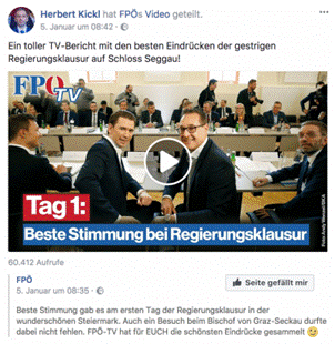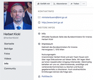 Mehrmals befanden sich auf der offiziellen Facebookseite des Bundesministers für Inneres, Herbert Kickl, Postings von Inhalten der FPÖ und Verlinkungen auf FPÖ-Webseiten. So wurde am 5.1. ein "FPÖ-TV"-Video der offiziellen FPÖ-Facebookseite und am 6.1. ein Gewinnspiel für das FPÖ-Neujahrstreffen geteilt. Zu diesen Zeitpunkten lautete das Impressum der Seite auf "Kabinett des Bundesministers für Inneres". Mittlerweile wurde das Impressum geändert, die betreffende Seite ist jetzt laut Impressum die persönliche Seite des Innenministers.