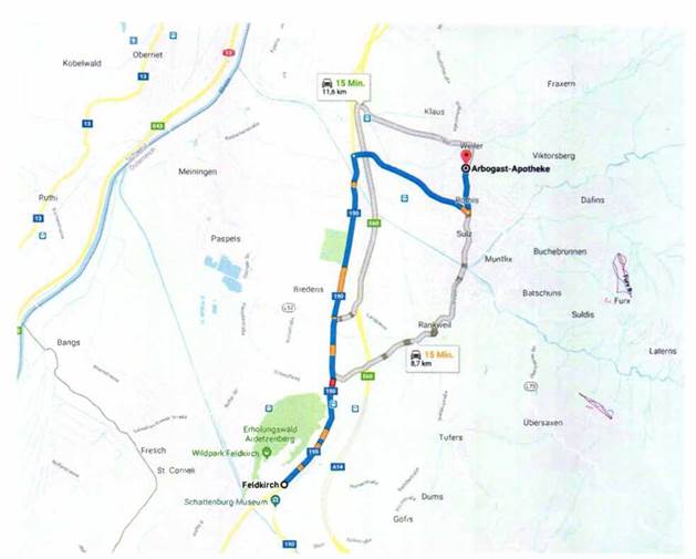 Dazu wurde uns folgender Sachverhalt zugetragen: Am 9. Juli 2018 benötigte eine ältere Patientin aus Tosters nach einer Behandlung am späten Abend im LKH Feldkirch ein Schmerzmittel. Im Internet haben Angehörige recherchiert, welche Apotheke Nachtdienst hat. Auf der Internetseite war zu lesen. „Die Feldkircher Apotheken sind rund um die Uhr für Sie da“. Die nächste Apotheke im Nachtdienst war die St. Arbogast-Apotheke in der Gemeinde Weiler. Kurz vor Mitternacht (23.28 Uhr) musste also ein Angehöriger der Patientin von Feldkirch-Tosters nach Weiler fahren, um ein notwendiges Medikament zu erhalten.