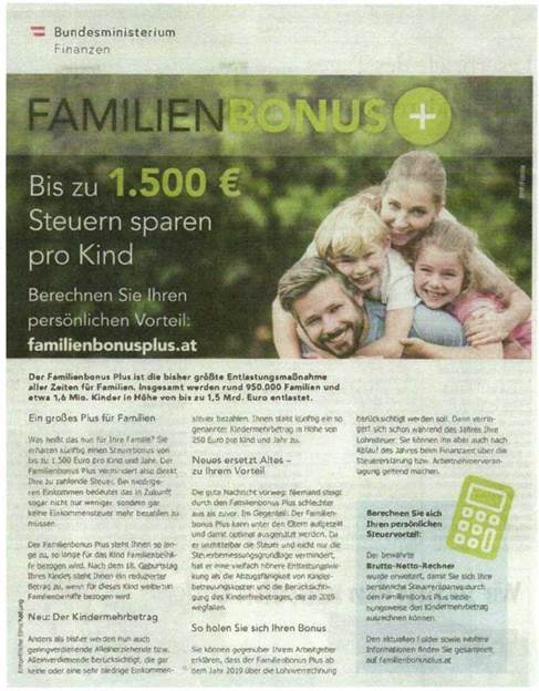 Anfang Juli wurde vom BMF eine Inseratenkampagne zum Familienbonus in den Printmedien durchgeführt[1]. Diese umfasste sowohl Schaltungen in den Zeitungen als auch Werbung an den Zeitungsständern für die Wochenendausgaben und müssten inzwischen abgerechnet sein. In den Richtlinien für die staatlichen Informations- und Werbemaßnahmen empfiehlt der Rechnungshof, dass die Öffentlichkeitsarbeit sparsam, wirtschaftlich und zweckmäßig sein soll[2]. Die Regierung hat sich im Regierungsprogramm vorgenommen im System zu sparen.