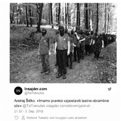 Die Kleine Zeitung vom 4. September berichtet, dass sich in der slowenischen Region Stajerska im Nordosten des Landes eine rechtsextreme bewaffnete Bürgerwehr formiert hat. Die Gruppe heißt "Stajerska varda" und soll nach Eigenangaben der Rechtsextremen mehrere hundert Mitglieder zählen. Ihr Ziel ist es, für den Grenzschutz zu sorgen[1]. Fotos, die in sozialen Netzwerken aufgetaucht sind, zeigen die maskierten und bewaffneten Figuren bei Übungen im Wald.
