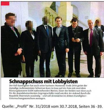 Im Profil 31/2018 berichtete Michael Nikbakhsh von einem Zusammentreffen (zwischen 2016 und 2017; vermeintlich 18.11.2016) in Graz, bei dem Sebastian Kurz auf ein Foto mit zwei dem Rüstungskonzern EADS nahestehenden Herren geriet (sh Abbildung unten; undatiert).[1]