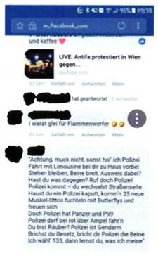 Weitere Mitglieder posteten „Ausseeee mit de Ausländer deine Ausländer Vorfahren gehören alle ins K“ oder kommentierten einen Artikel über antifaschistische Proteste in Wien mit den Worten: „I warat glei für Flammenwerfer.