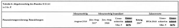 Monatserfolge weisen in der Finanzierungsrechnung zum Abgabenerfolg des Bundes (hier im Monatserfolg August Tabelle 6) die Unterschiede (in %) zum Vorjahr aus - zum einen zum kumulierten Monatserfolg, zum anderen zu den Jahreswerten (siehe Abb. 1). Der kumulierte Monatserfolg widmet sich dem tatsächlich bisher verzeichneten Unterschied über die betrachtete Periode. Die Jahreswerte widmen sich dem vom BMF veranschlagten Unterschied für das Gesamtjahr. Die prozentuelle Angabe gewährleistet eine gewisse Vergleichbarkeit.