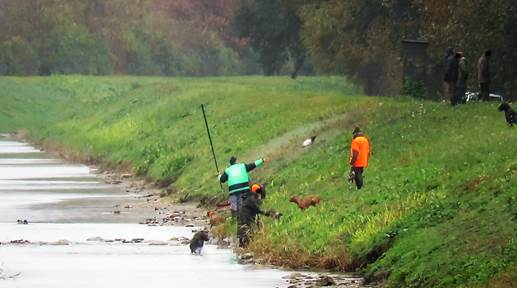 Auf dem Bild ist zu erkennen, wie ein Hund die ausgesetzten zahmen und auf die „Jäger“ zu schwimmenden Zuchttiere im Wasser „jagt“.
