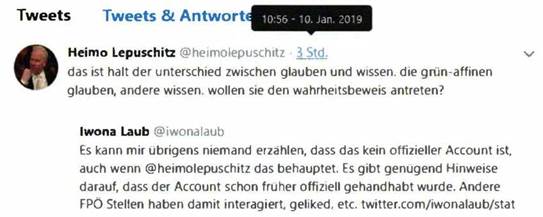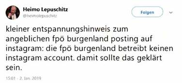Auf Twitter gab sich vor allem Heimo Lepuschitz, Mitarbeiter im Bundesministerium für Verkehr, Innovation und Technologie, als überdurchschnittlich informiert in dieser Sache aus. Der Medienkoordinator im Ministerbüros von Norbert Hofer[2] mimte den FPÖ-Burgenland- Pressesprecher und versuchte dabei, die Verantwortung und Urheberschaft für den mutmaßlich hetzerischen Instagram-Kommentar der FPÖ-Burgenland zum Thema Neujahrsbaby in Abrede zu stellen.