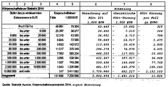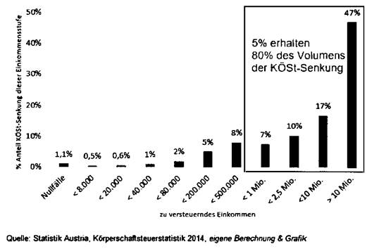 Körperschaften im Einkommensbereich über 10 Mio. € würden 47% des Anteils der KÖSt- Senkung bekommen, das sind aber nur 317 (0,2%) Steuerfälle von insgesamt 131.646. Steuerpflichtige Einkommen von über 500.000 € erwirtschaften 6.382 Unternehmen, das sind etwa 5% der Steuerpflichtigen, vom Volumen einer KÖSt-Senkung würden diese aber mehr als 80% bekommen.