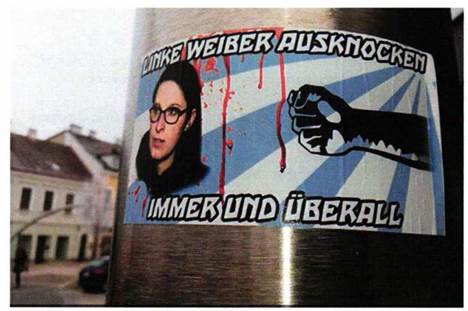 Laut Medienbericht der Niederösterreichischen Nachrichten vom 24. Jänner 2019 wurde in Bruck an der Leitha ein Aufkleber mit der Aufschrift „Linke Weiber ausknocken - immer und überall" entdeckt. Der Aufkleber zeigt eine öffentlich bekannte Expertin im Bereich Rechtsextremismus und ruft zu Gewalt gegen sie und andere Frauen auf. Der Aufkleber soll auf einer Säule neben dem ehemaligen Bank- Austria-Gebäude am Körnerplatz in Bruck an der Leitha geklebt haben.[1] Impressum oder Bildnachweis sind auf dem Sticker nicht zu finden.