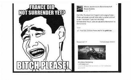 Auf ihrer Facebook-Seite veröffentlichte die Burschenschaft Bruna Sudetia am 3. Juli 2014 die Fußball-WM in Anspielung auf die Konstellation des Zweiten Weltkriegs wie folgt: "Die USA, Russland und England sind ausgeschieden, Polen war wieder einmal nicht mehr zu sehen und nun ist der Franzmann 'Last man standing'. Einmal etwas Neues, aber die deutsche Mannschaft ist #bereitwienie"."