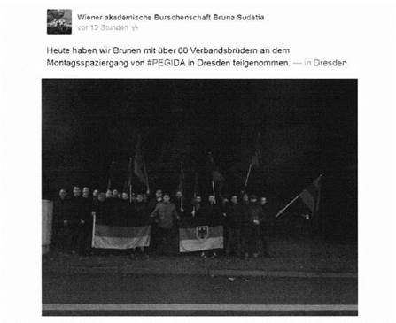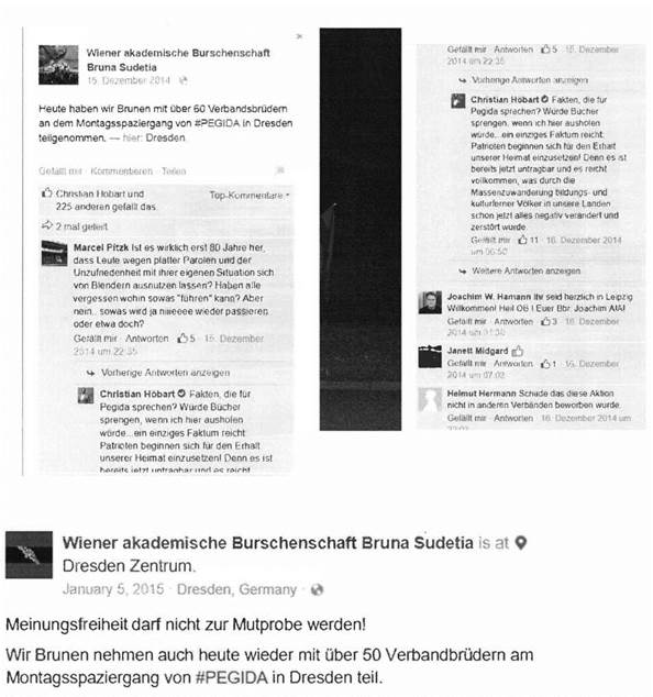 Dieses Posting der Burschenschaft "gefällt" auch dem FPÖ-Nationalratsabgeordnete Christian Höbart, der im Herbst 2014 Schutzsuchende auf Facebook als „Erd- und Höhlenmenschen" bezeichnet hatte[17]: Höbart kommentierte auch den Beitrag der Burschenschaft: „Fakten, die für Pegida sprechen? Würde Bücher sprengen, wenn ich hier ausholen würde...ein einziges Faktum reicht: Patrioten beginnen sich für den Erhalt unserer Heimat einzusetzen! Denn es ist bereits jetzt untragbar und es reicht vollkommen, was durch die Massenzuwanderung bildungs- und kulturferner Völker in unsere Landen schon jetzt alles negativ verändert und zerstört wurde."