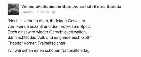 2015 postete die Burschenschaft auf ihrem facebook-Profil am österreichischen Nationalfeiertag ein in der extremen Rechten beliebtes Zitat, das Theodor Körner zugeschrieben wurde, tatsächlich jedoch von der neonazistischen Nationaldemokratischen Partei Deutschlands (NPD) stammt: "Noch sitzt ihr da oben, ihr feigen Gestalten, / vom Feinde bezahlt und dem Volke zum Spott. / Doch einst wird wieder Gerechtigkeit walten, / dann richtet das Volk und es gnade euch Gott."
