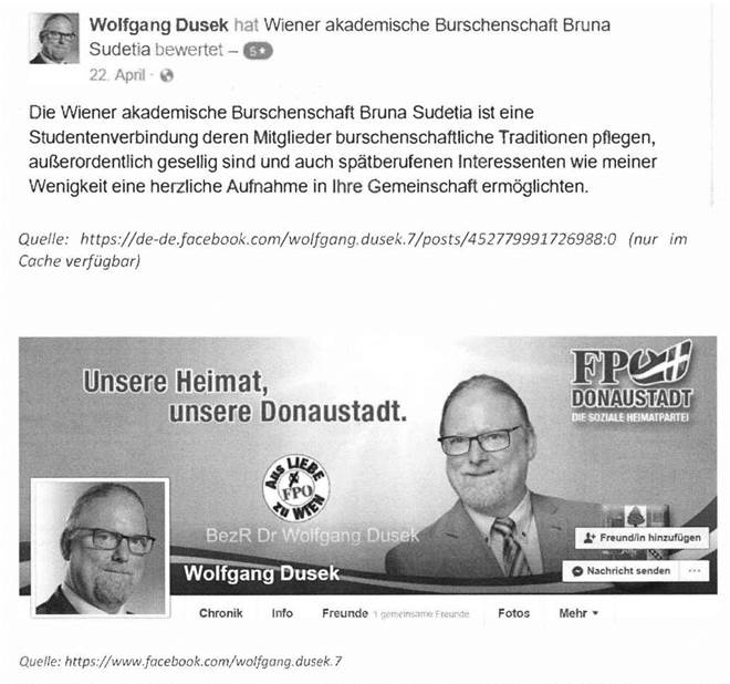 Ø Wolfgang Dusek, Bezirksrat der FPÖ in der Donaustadt (Wien, 22. Bezirk), dieser bewertete die Burschenschaft auch auf Facebook mit folgender Beschreibung: