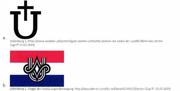 [5] Zwei Symbole sind in der Verordnung ausgeführt: Erstens das Ustascha-U mit darin befindlicher silbernen Granate und darauf befindlichem Ustascha-U (Nr. 22 der Symbole-Bezeichnungs-Verordnung), zweitens das Ustascha-Wappen (Schachbrettmuster) mit dem direkt darüber befindlichem „U“ mit rot-weißer Verzierung (Nr. 23, SymbVerzV).