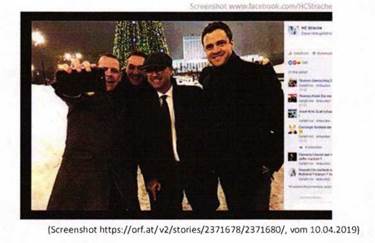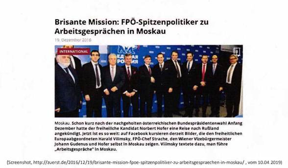 Obwohl die Teilnahme der FPÖ-Politiker an solchen "Wahlbeobachtungsmissionen" an der Glaubwürdigkeit Österreichs als vertrauenswürdiger europäischer Partner schwer kratzt, wurde 2016 der rege Austausch mit einem "Freundschaftsvertrag" zwischen der FPÖ und Putins Partei "Einiges Russland" besiegelt. Die FPÖ-Delegation auf dieser Moskau-Reise bestand, wie man aus den Selfie-Grüßen erkennen kann, aus dem derzeit amtierenden Vizekanzler Heinz-Christian Strache, dem aktuellen Verkehrsminister Norbert Hofer, dem jetzigen Klubobmann Johann Gudenus und dem aktuellen FPÖ-Abgeordneten zum EU-Parlament Harald Vilimsky. Das Treffen wurde in einem Beitrag im rechtsradikalen Magazin "Zuerst!" von Manuel Ochsenreiter (ein ehem. Mitarbeiter von Frohnmaier, langjähriger Freund von Johann Gudenus,[4] und letzter Redner beim Kongress "Verteidiger Europas"[5]) dokumentiert.