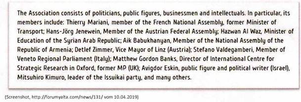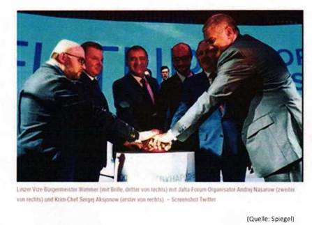 Zudem nehmen FPÖ-Politiker regelmäßig an dem Internationalen Jalta Wirtschaftsforum, einer Veranstaltung des russischen Regimes, teil. Im April 2016 waren noch die FPÖ-Parlamentarier Axel Kassegger und Barbara Rosenkranz in ein Luxushotel in Jalta gereist. Im April 2017 fuhren der damalige FPÖ-Bundesrat und jetzige FPÖ-Nationalratsabgeordnete Hans-Jörg Jenewein sowie der damalige FPÖ-Nationalratsabgeordnete Johannes Hübner zum Jalta Forum auf die völkerrechtswidrig annektierte Krim.[6] Am 6, November 2017 wurde die internationale Vereinigung der "Freunde der Krim" in Jalta gegründet, unter den Anwesenden finden sich Hans-Jörg Jenewein sowie der Linzer Vizebürgermeister Detlef Wimmer, die auch als Mitglieder der "Freunde der Krim" aufscheinen:[7]