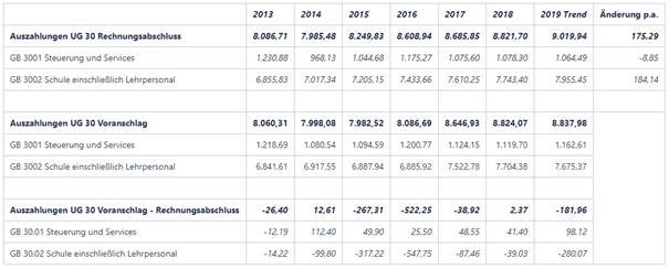 Für das Jahr 2019 wurden in der UG 30 Auszahlungen in Höhe von 8,838 Mrd. € und damit eine Steigerung von 16 Mio. € gegenüber dem Voranschlag 2018 budgetiert. Im Globalbudget 30.01 Steuerung und Services werden 2019 mit 1,161 Mrd. € um 43 Mio. € mehr veranschlagt als im Jahr 2018. Die Auszahlungen im Globalbudget 30.02 Schule und Lehrpersonal sinken hingegen um 29 Mio. € von 7,704 Mrd. € auf 7,765 Mrd. €.