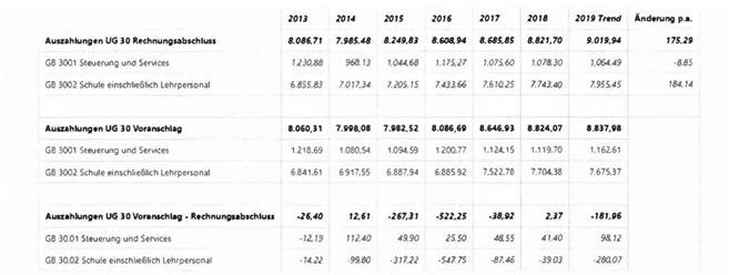 Die Trendrechnung ergibt, dass die Auszahlungen der UG 30 im Jahr 2019 9,02 Mrd. € erreichen und damit um 182 Mio. € über den im Voranschlag 2018 budgetierten 8,838 Mrd. € liegen. Für das Globalbudget 30.02 Schule einschließlich Lehrpersonal ergibt die Trendrechnung eine Unterdotierung des Voranschlags von 280 Mio. €.