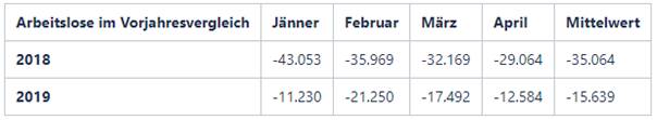 Der Vergleich der für 2018 und 2019 vorliegenden Monatszahlen des AMS zeigt, dass die Dynamik der Erholung am Arbeitsmarkt in den ersten 4 Monaten des Jahres 2019 deutlich abnahm. Während die Zahl der Arbeitslosen zwischen Jänner und April 2018 im Vorjahresvergleich um durchschnittlich 35.064 Personen abnahm, nahm die Zahl der Arbeitslosen im selben Vergleichszeitraum 2019 nur mehr um 15.369 Personen ab.