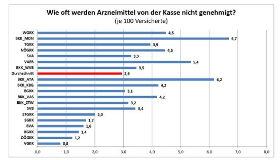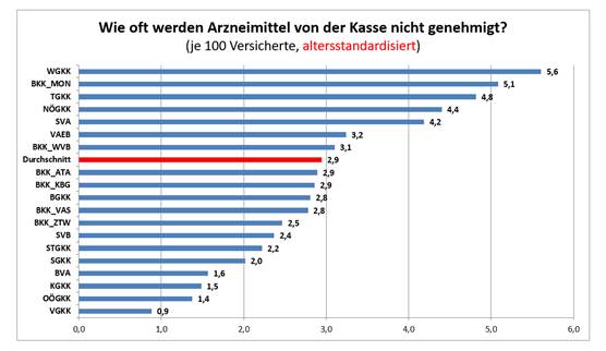 Anfragebeantwortung 13017/AB XXV. GP (https://bit.ly/2WUwTzy) hat gezeigt, dass es bei bewilligungspflichtigen Arzneimitteln zwischen den Krankenkassen enorme Unterschiede bei der Arzneimittel-Bewilligungswahrscheinlichkeit (bzw. Arzneimittel-Nicht-Genehmigungsquote) gibt. So gab es bei er VGKK 2016 altersstandardisiert im Schnitt 0,9 Ablehnungen pro 100 Versicherte, während dieser Wert bei der WGKK um ein Vielfaches höher lag: 5,6 Ablehnungen je 100 Versicherte.