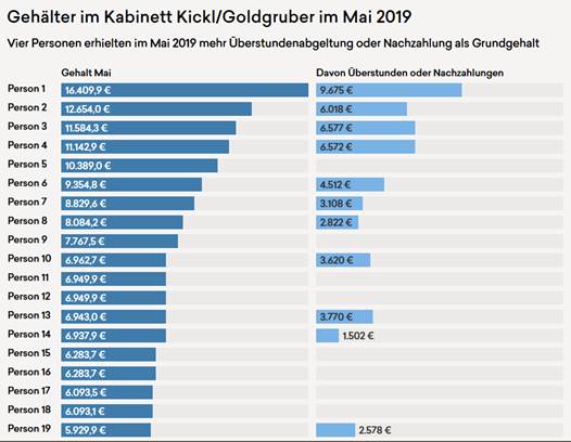 In einer weiteren Grafik werden die „Gehälter im Kabinett Kickl/Goldgruber im Mai 2019“ ausgewiesen: