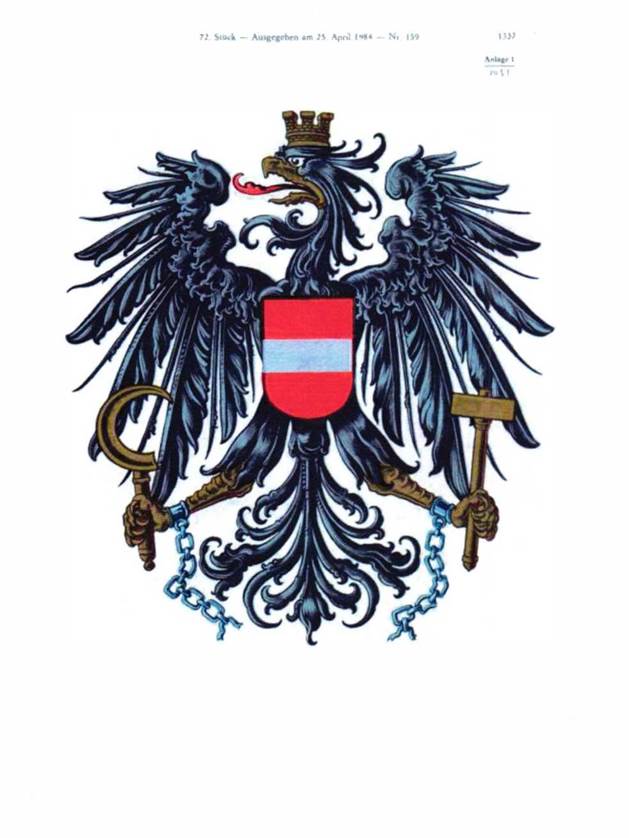 Art 8a B-VG beschreibt die wesentlichen Details samt den Farben des Staatswappens. Das Wappengesetz, BGBI. Nr. 159/1984 idF BGBI. I Nr. 161/2013, enthält die Darstellung des Bundeswappens in der einen Bestandteil dieses Gesetzes bildenden Anlage (s Anlage 1 „Staatswappen“).