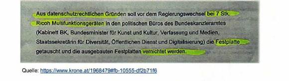 Demnach sollen die sieben Festplatten aus datenschutzrechtlichen Gründen um einen Betrag von knapp 2.100 € geschreddert worden sein. Sie sollen aus den Regierungsbüros von ex-Bundeskanzler Christian Kern, ex-SPÖ-Wahlkampfmanager und ex-Bundesminister Thomas Drozda sowie ex-Staatssekretärin Muna Duzdar stammen.