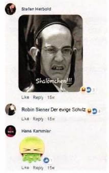 Besonders abscheulich und für einen österreichischen Beamten auch nicht akzeptabel ist der Umstand, dass Preiszler Artikel und Karikaturen von der Facebook-Seite des berüchtigten Neonazis und Antisemiten Uwe Meenen teilt, welcher etwa nachstehende Karikaturen betreffend den deutschen Politiker Martin Schulz postet. (s. Foto unten)