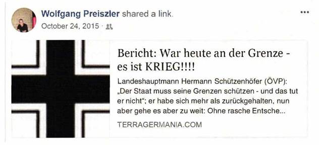 Interessant erscheint in dem Zusammenhang auch die Tatsache, dass Preiszier vom FPÖ- Niederösterreich-Parteiobmann und Nationalratsabgeordneten Christian Höbart, der immer wieder mit rechtsextremen Mitteilung auffällt, auf dessen Facebook-Seite als jemand gelobt wird, der "in meiner Mannschaft" ist.