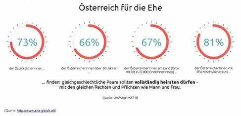 In 15 europäischen Ländern erfolgte die Eheöffnung durch die jeweiligen Parlamente, also auf politischem Weg. In Österreich war das in der Vergangenheit nicht möglich, obwohl bereits 2015 laut einer Eurobarometer-Umfrage 62 Prozent der Österreicher_innen die Öffnung der Ehe für gleichgeschlechtliche Paare befürworteten.