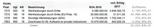 Die Differenzensumme zwischen 2017 und 2018 ist mit 52 Mio. € beachtlich, und war schon Thema in den parlamentarischen Beratungen zum Budget selbst. Auch wenn man den Budgetansatz iZm der „EU-Präs.18" herausrechnet, bleibt immer noch eine Steigerung von 17 Mio. € auf „diversen" Sachaufwandkonten.