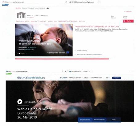 Im Vorfeld der Wahl zum Europäischen Parlament informiert auch das Österreichische Parlament auf ihrer Webseite über diese wichtige Wahlauseinandersetzung. Auffällig hierbei ist die unleugbare Ähnlichkeit mit den Farben der Österreichischen Volkspartei und den türkisen Schriftzügen am Sujet, welches hierfür verwendet wird.