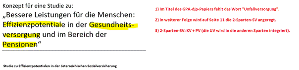Das Papier trägt folgenden Titel „Konzept für eine Studie zu: Bessere Leistungen für die Menschen: Effizienzpotentiale in der Gesundheitsversorgung und im Bereich der Pensionen“ und ist offensichtlich das Studienkonzept für die LSE-Studie gewesen. Auf Seite 11 wird relativ offen die Prüfung einer Auflösung der UV-Sparte und Eingliederung in die PV- bzw. KV-Sparte gefordert, wie in „neueren Sozialversicherungssystemen“. Das erklärt auch ein Stück weit, weshalb im Titel des Papiers, neben "Gesundheitsversorgung" und "Pensionen", das Wort "Unfallversorgung" nicht erwähnt wird (Grafik 1). In der LSE-Studie wird unter "Modell 3" das entsprechende 2-Spartensystem als mögliche Reformvariante vorgestellt (Grafik 2).