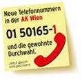 Beachten Sie, dass Sie uns ab sofort unter einer geänderten Rufnummer erreichen. Bitte speichern Sie gleich Ihren Kontakt zur AK Wien ein unter 501 65 1, gefolgt von der gewohnten Durchwahl.