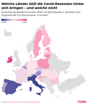 Die österreichische Wirtschaft wird sich auch im heurigen Jahr nicht vollständig von der Pandemie-bedingten Rezession erholen. Das ist das Ergebnis der jüngsten EU-Prognose. Die EU bestätigt damit, was viele Wirtschaftstreibende angesichts eines sehr lang anhaltenden Lockdowns längst befürchtet haben. Österreich ordnet sich bei der wirtschaftlichen Entwicklung zwischen Portugal und Spanien ein. Im Norden und Osten Europas wird die Wirtschaftsleistung bereits heuer wieder auf das Vorkrisenniveau steigen.