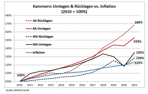 In den Kammergesetzen für die Arbeiterkammern und Wirtschaftskammern sind die Kammern zwar eindeutig als Non-Profit-Unternehmen (Ausgaben = Umlagen) definiert, trotzdem sind ihre Umlagen und Rücklagen in den letzten Jahren deutlich stärker gestiegen als die Inflation. Das liegt zum einen daran, dass die Aufsicht der Kammern (Bundesministerium für Arbeit und Wirtschaft) zu wenig auf die Einhaltung der Kammergesetze pocht und zum anderen daran, dass in den Kammergesetzen die Umlagen-Höchstgrenzen zu hoch angesetzt (AK-Gesetz) oder gar nicht festgelegt sind (WK-Gesetz). Diese Umstände und die schleißige Aufsicht ermöglichen es den Kammern, regelmäßig Überschüsse zu erzielen. So hoben die Wirtschaftskammern 2021 809 Mio. Euro an Umlagen ein und erzielten dabei 136 Mio. Euro an Überschüssen, was einer Umlagen-Rendite von 17 Prozent entspricht! Und da,s obwohl die Wirtschaftskammern gleichzeitig noch 59 Mio. Euro an Zusatzpensionen zu stemmen hatten. Ähnlich verhielt es bei den Arbeiterkammern, die Umlagen in Höhe von 530 Mio. Euro einhoben und 67 Mio. Euro Überschuss erzielten, trotz 58 Mio. Euro Aufwänden für Zusatzpensionen. Die regelmäßigen Überschüsse führen dazu, dass die Rücklagen der Kammern in den letzten Jahren stark gestiegen sind. So liegen die Rücklagen den Arbeiterkammern mittlerweile bei 571 Mio. Euro (mehr als ein Jahresaufwand) und bei den Wirtschaftskammern bei 1,78 Mrd. Euro (mehr als der zweifache Jahresaufwand).