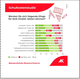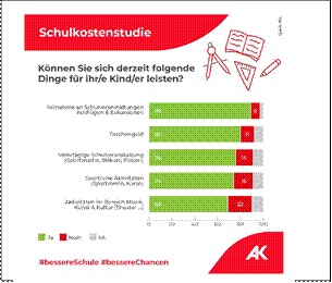 Es ist nichts Neues, dass im Jahresverlauf auf Eltern eine Reihe zusätzlicher schulischer Ausgaben zukommen, von Schulmaterialien über Beiträge für die Klassenkassa bis zu den Zahlungen für Schulveranstaltungen, wie Sportwochen. Zusätzlich werden Druckbeiträge, Sport- oder Musikkurse, Essensgeld sowie Kosten für die ganztägige Betreuung fällig. Erschwerend dieses Jahr ist, dass aufgrund der allgemeinen Teuerung auch von Eltern im kommenden Schuljahr in fast allen Bereichen Kostensteigerungen bzw. ein höherer finanzieller Aufwand erwartet wird. So werden beispielsweise für mehr als die Hälfte der Schüler*innen in Österreich ein Anstieg des schulischen Essensgeldes, höhere Schulveranstaltungskosten und teurere Materialkosten erwartet. Ähnliches trifft auf Kindergärten zu. Damit ist klar, in welchem Ausmaß die Teuerung die Bildungsteilhabe von Kindern und Jugendlichen einschränken könnte.[2]