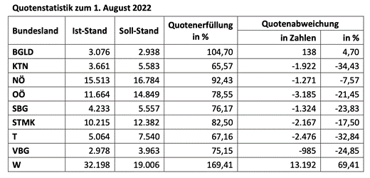 Quelle: Quotenstatistik der Grundversorgung, Stand 01.08.2022 (Beantwortung des Bundesministerium für Inneres, parlamentarischen Anfrage der NEOS 11630/AB zu 11922/J).
